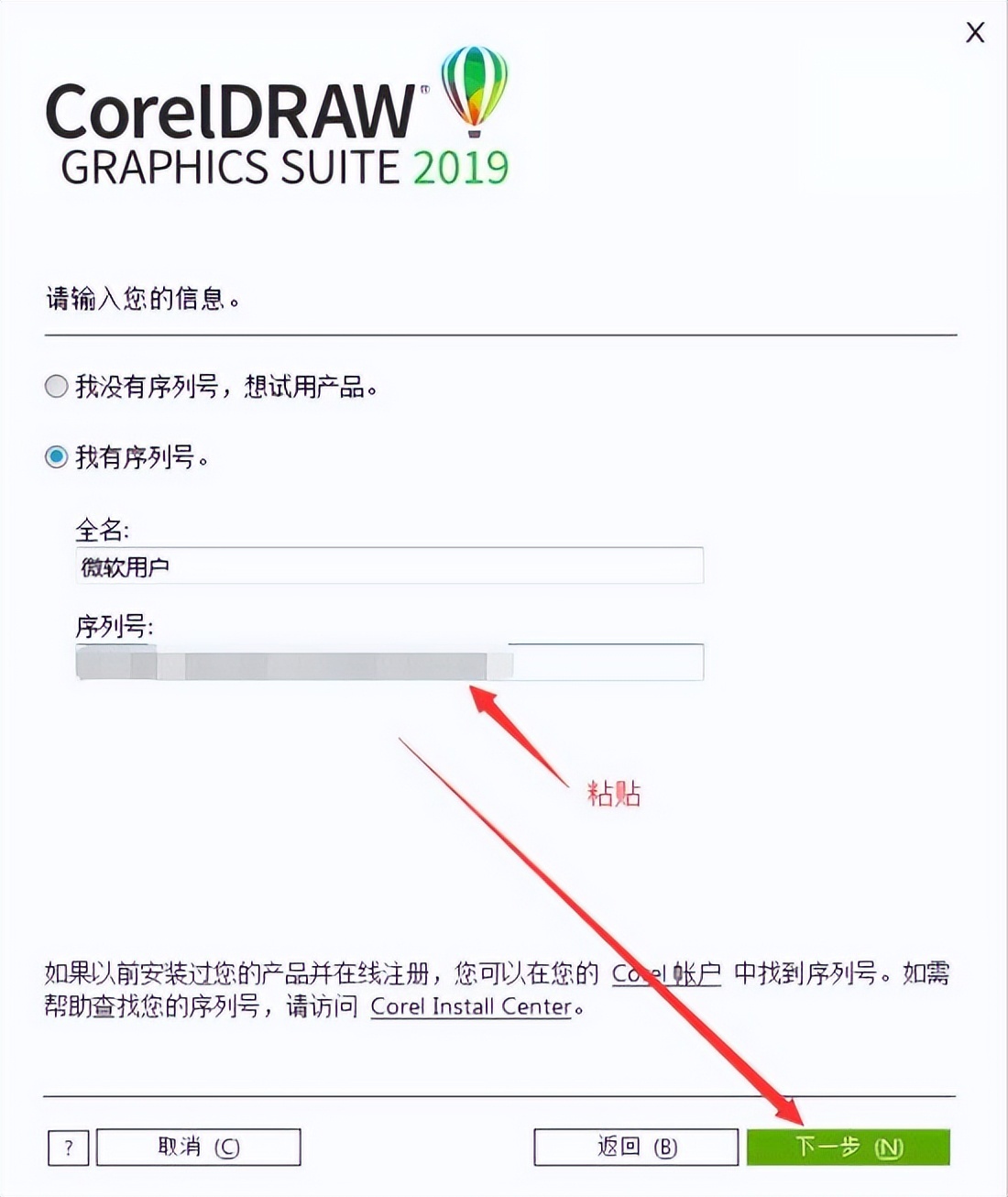 然后把CDR2019序列号粘贴到激活界面里面,点击下一步