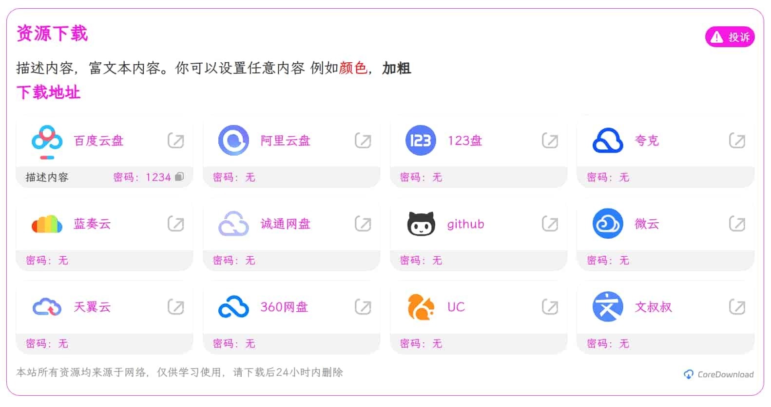CoreDownload 是一款高级WordPress 下载增强插件,支持几乎所有网盘,为WordPress增加任意下载功能,目前免费提供使用。