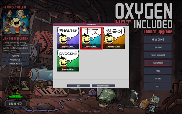 2、进入游戏后,选择第四个选项“Translations”选择图的中文,重启即可将英文设置为中文