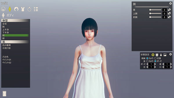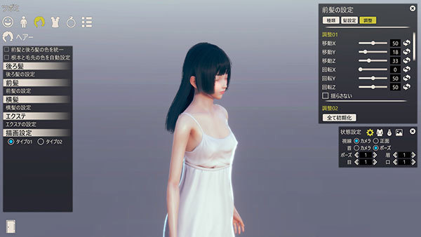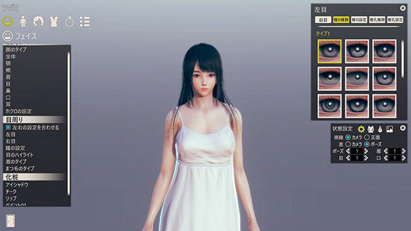 目、鼻、口、耳分别对应五官的细致调控。眼睛方面可以调节眼睛的位置和眼角的高低(决定了眼型),眼睛的位置游戏设计的很贴心,默认给的就是最佳值就不需要大动除非是有特殊癖好人士。外眼角(目尻)和内眼角(目头)的位置调节可以用来调整眼型,两端保持平行这样的眼型在现在算是比较主流的可爱系设定,当然如果喜欢帅气一点的类型那么就将外眼角稍微太高一点即可,此外眼睛还提供了眼睑(まぶた)的选择。鼻子详细到能捏整个鼻子的造型,前后角度,鼻翼的宽度和鼻子的高度等。嘴巴方面的调整和眼睛比较类似,除了大小属性的基础调整外,还可以调整嘴角的高低,像甜美系给人的刻板影响就是微微上扬而高冷一些的则保持水平。这里很多选项看似用不上不过I社都做得非常齐全给玩家提供了充分的选择。