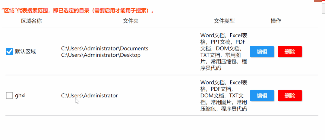 一般情况下,这些文件类型我们拿来搜索文件里是够用的,在使用之前,我们需要配置一下它的索引范围。在软件的右上角,双击那两个输入框,就会弹出来编辑的界面,在这里添加一个目录,可以为每个目录选择不同的文件类型。