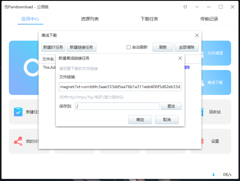 离线下载功能支持 http/ftp/ed2k,以及磁力协议下载。不过经过测试大多数情况出现离线下载失败,可能是软件还在测试版的原因?