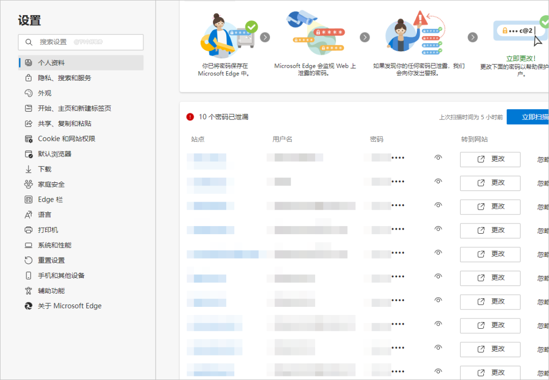 如果你习惯了用 Edge 自带的密码管理来记录账号密码,在设置里面的密码安全也会提示相关泄漏的账号密码,优点可以看到哪个网站泄漏的什么密码,如果你觉得没被泄漏,也可以点击旁边的忽略按钮。