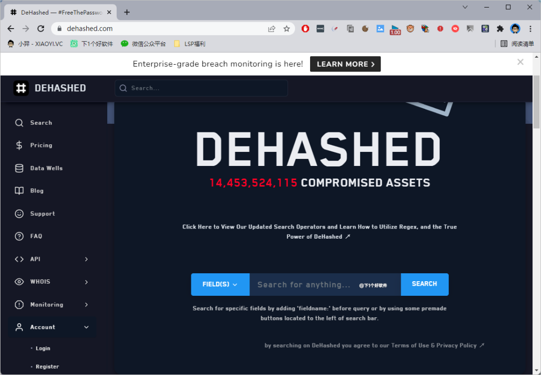 网络安全公司 Dehashed 在线查询工具,收集了一百多亿条信息,覆盖的数据量非常多,支持用户名、邮箱、地址、支持正规则表达等多种方式查询。