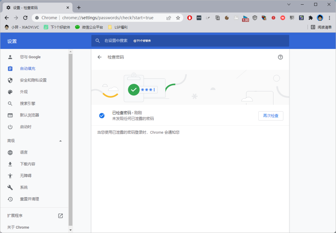 在 Google 浏览器的密码管理器同样会显示你泄漏的账号密码,进入设置 – 自动填充 – 密码 – 检查密码 – 点击检查开始扫描。