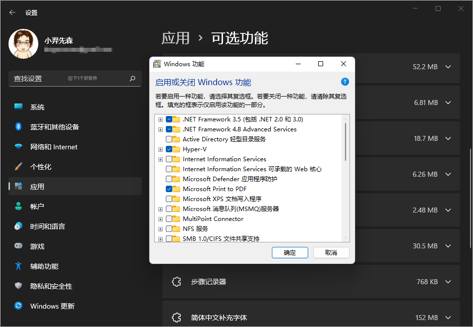 3.应用 – 可选功能 – 更多 Windows 功能 – 开启 hyper-v 和 虚拟机平台;