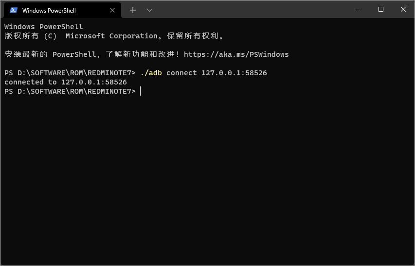 3.输入命令:./adb connect 127.0.0.1:58526 (查看端口在 WSA 设置里面的开发人员模式位置)*如果连接失败,请尝试卸载安装的安卓模拟器,或者其它安卓手机管家类的软件。