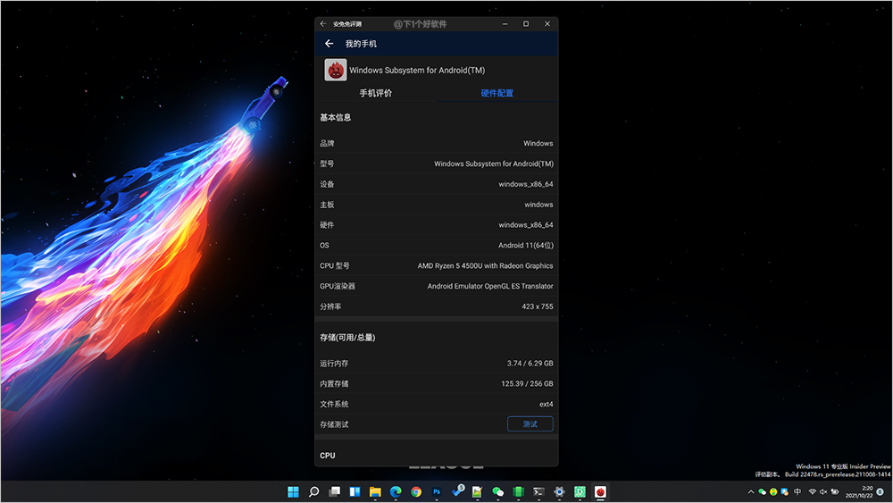 性能跑分方面,不知道为啥安兔兔测试了好几次都没有成功,不过在安兔兔里面可以识别到 WSA 系统,也不少老哥在里面评论,很欢乐。