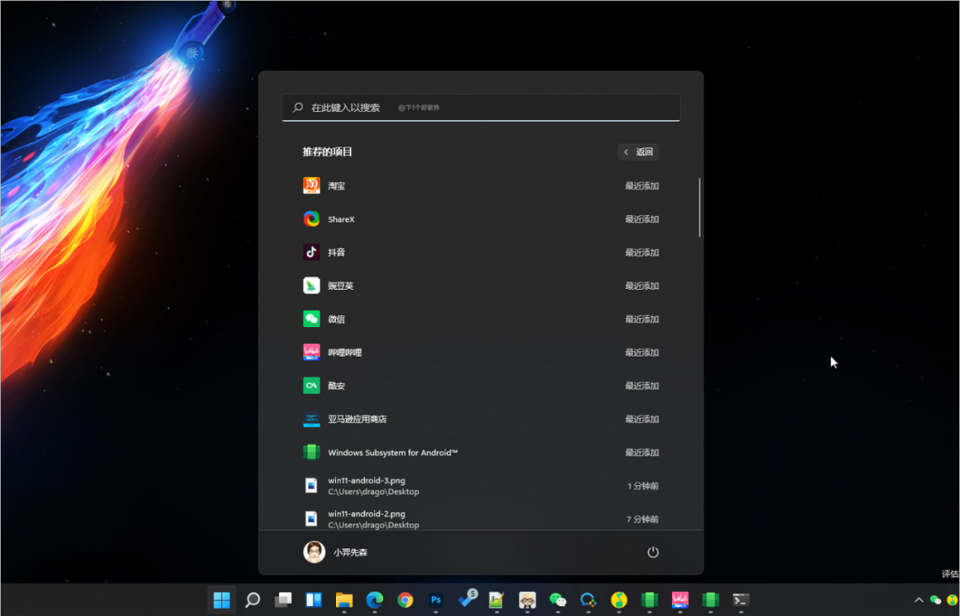 5.在开始菜单就可以看到已经安装的安卓应用了,每次都用命令安装太麻烦,所以建议先安装一个应用市场,例如酷安、豌豆荚。