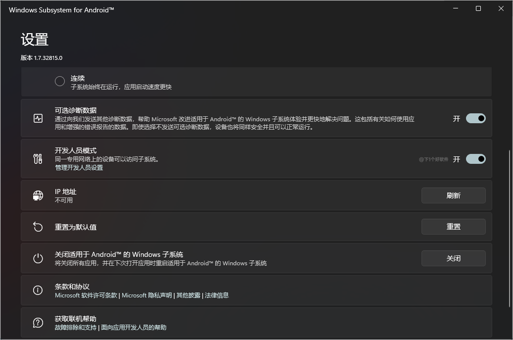 1.打开 Windows Subsystem for Android 安卓子系统 – 设置 – 开发人员模式 – 开启。