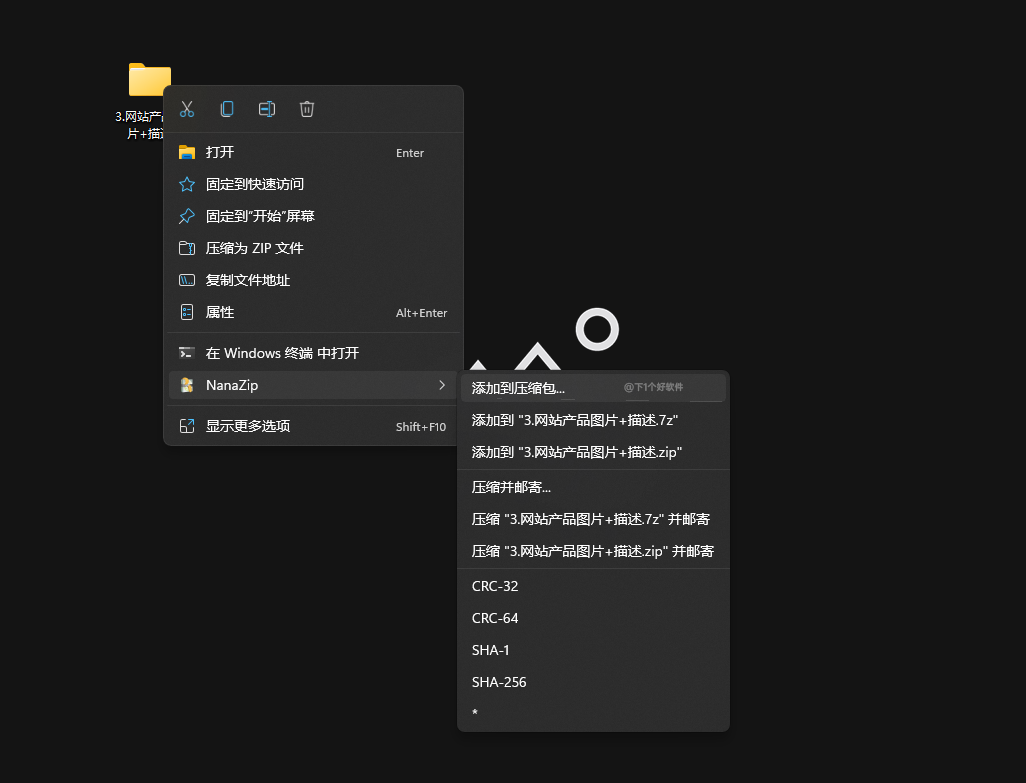 接下来在右键菜单项就可以看到 NanaZip 了,所有功能项整合在一起也挺好的,可以让右键菜单更简洁。