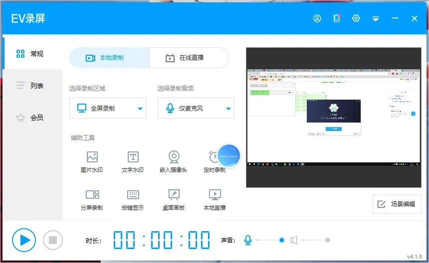 EV录屏集视频录制与直播功能于一身的桌面录屏软件,完全免费。支持桌面和摄像头组合录制,在选择全屏/区域录制桌面时,还可以叠加摄像头。可单独录制系统音或麦克风音,也可以同时录制。课程PPT、教师摄像头、教学大纲三个场景同步进行,以及实时屏幕共享、直播推流等功能。