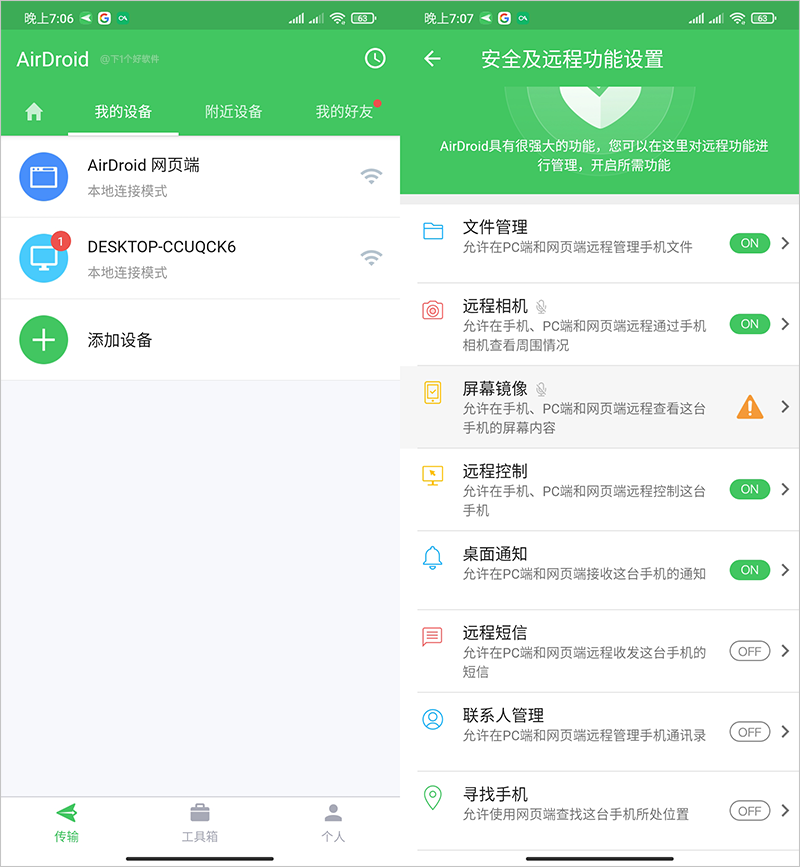 安卓手机端的「AirDroid」你需要给予一些权限,例如文件管理、通讯录、镜像投屏、应用管理等,根据提示允许就行了。