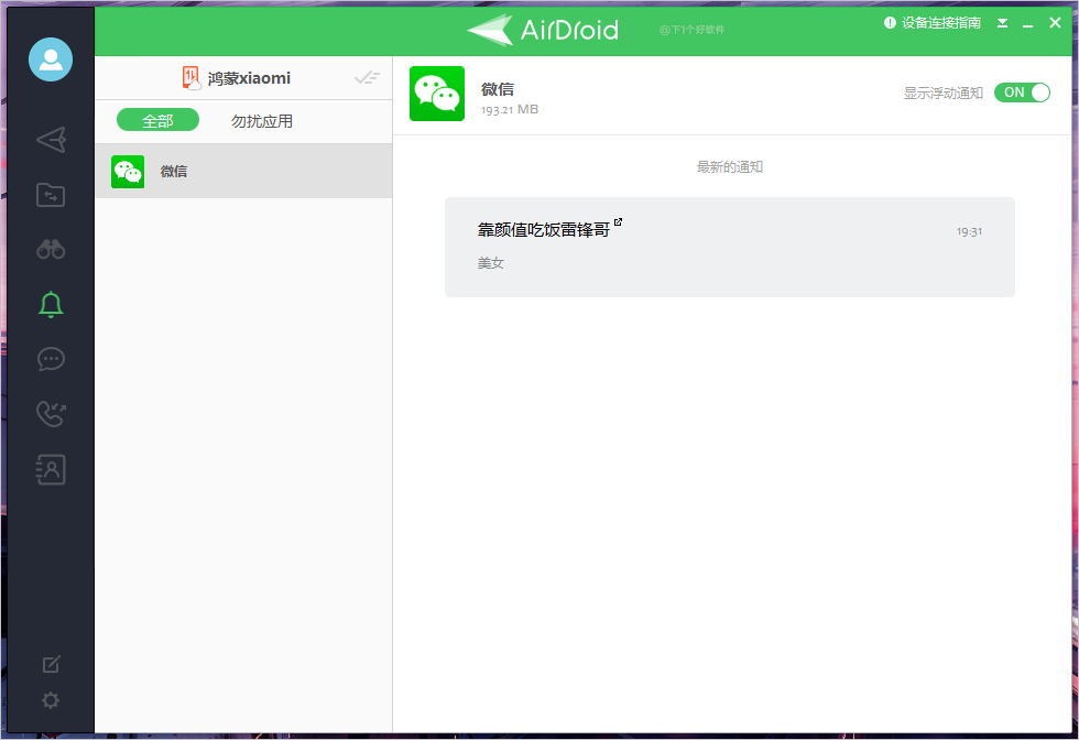 手机应用通知:可以在电脑上同步收到手机上的消息通知,不过不能回复消息,支持设置勿扰的应用。