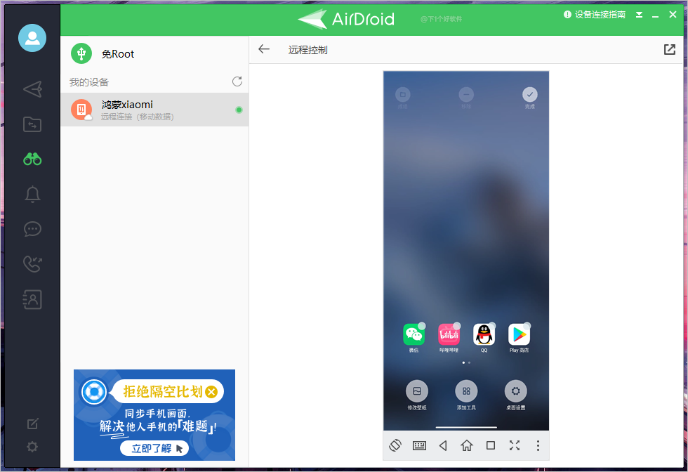 远程控制手机:之前介绍的电脑控制手机软件都是在局域网本地,而「AirDroid」它是支持远程控制的。为了测试,关了手机的 WIFI,采用流量的方式,如下图,可以看到显示移动数据状态。