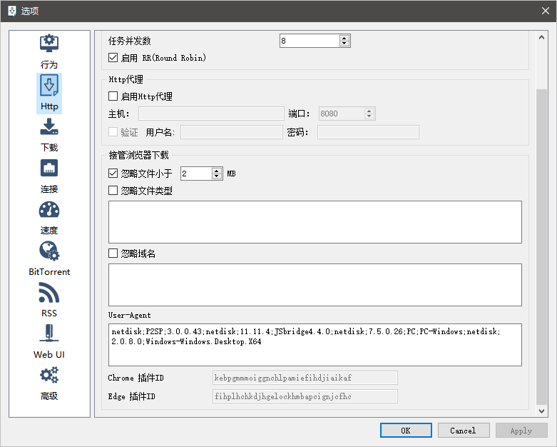 打开 Xdown 的选项,找到 Http – UA 设置,填入下载页面提示的 UA 地址。其它下载工具类似设置。