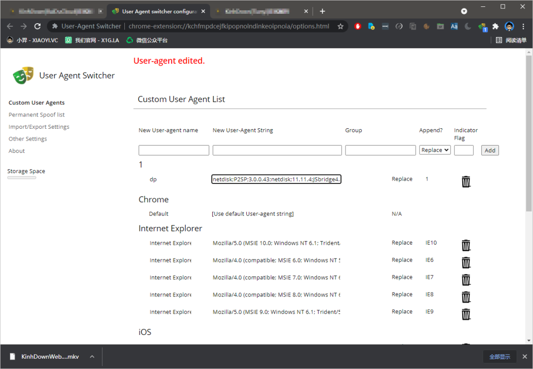 如果你的浏览器有安装 User-Agent 扩展插件,也可以扩展插件直接修改 UA 地址后,通过浏览器下载。