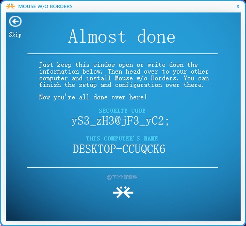 然后服务端电脑在 Mouse without Borders 的启动界面,选择 NO,然后就会出现 CODE 和 电脑名称。