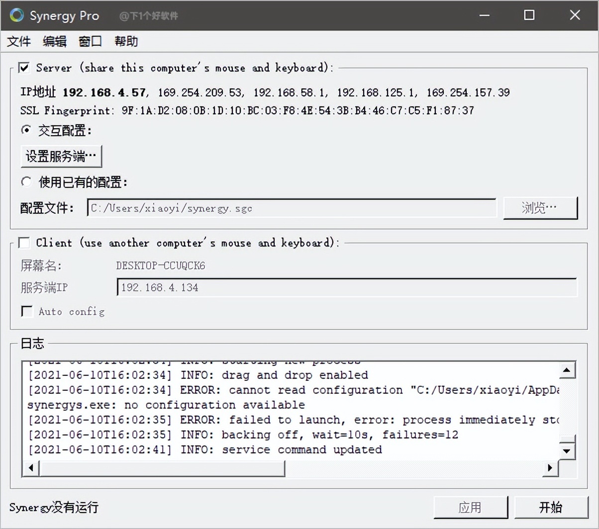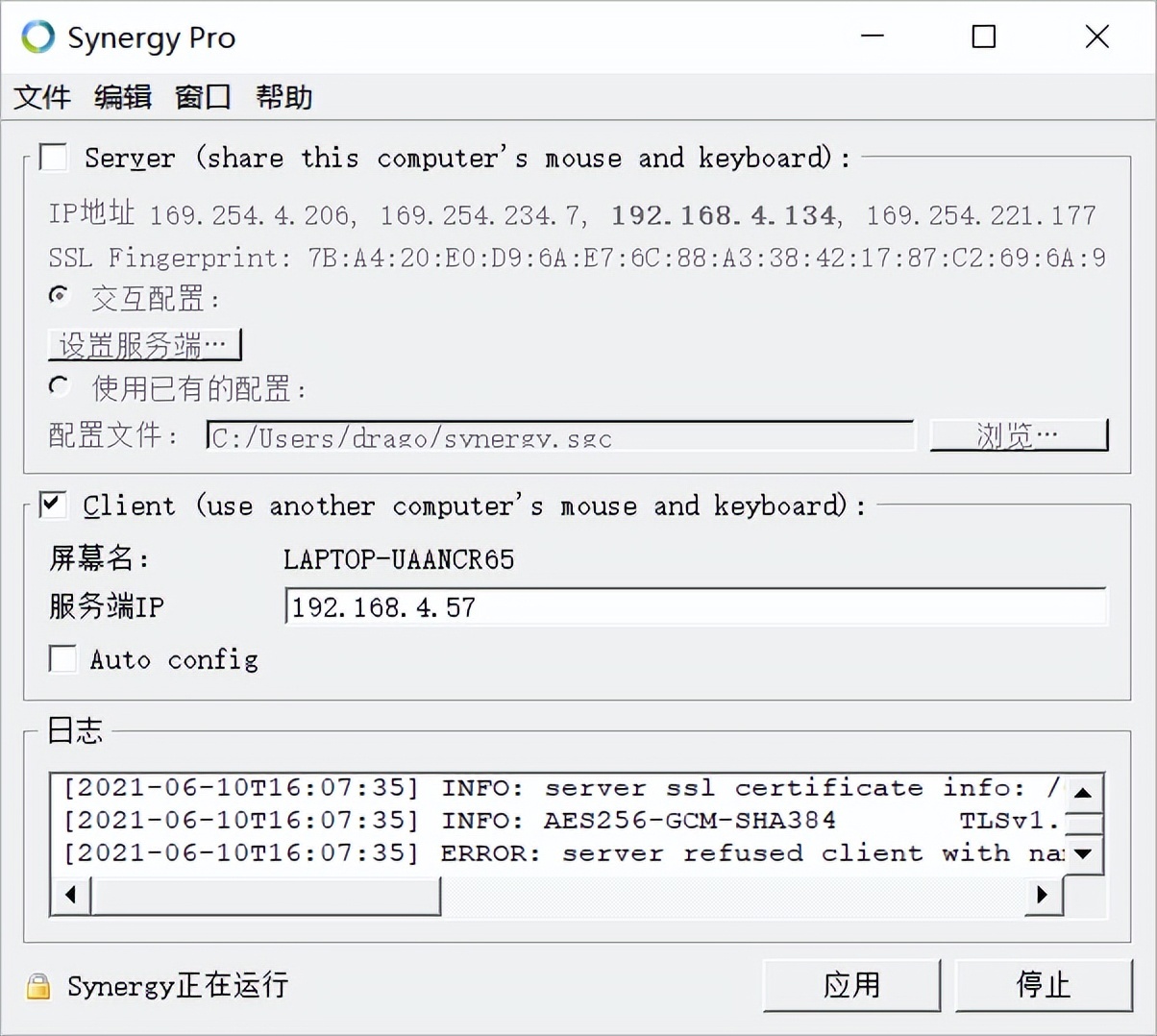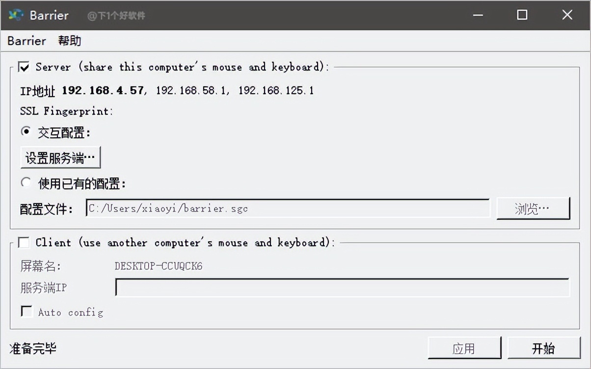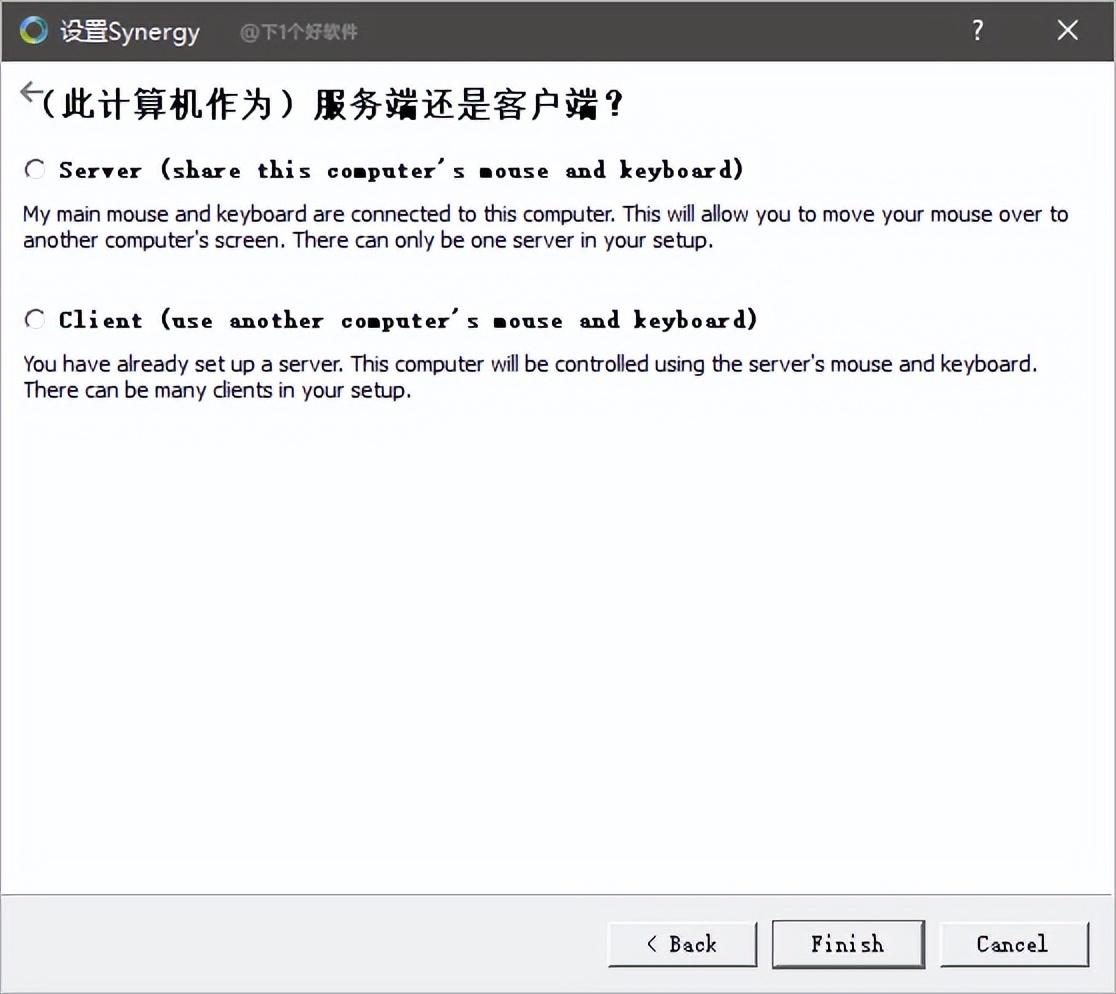 同样需要电脑在同个局域网内,安装 Synergy 好后,会让你选择当前电脑作为服务端,还是客户端。