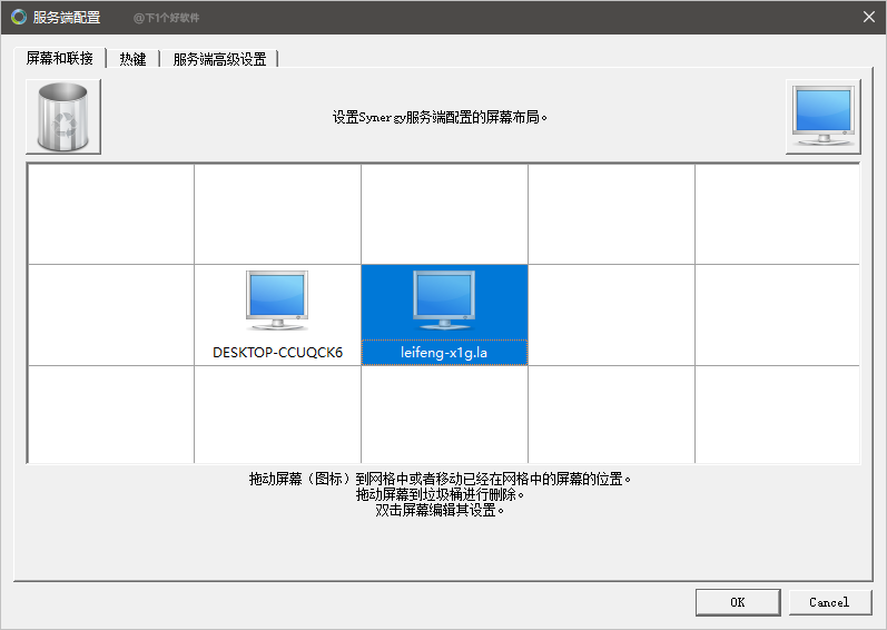 进入服务端功能,右上角拖动电脑图标,添加客户端。例如你的另外一台电脑在右边,那就放到当前电脑的右边位置。这里要注意:需要命名为客户端电脑对应的屏幕名称。确定后,回到主界面,点击开始。