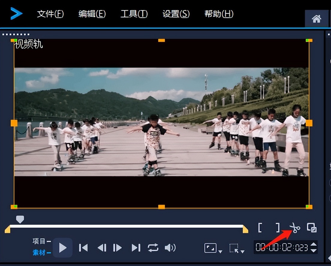 第二步,开始用会声会影剪辑视频。按照软件提示导入需要剪辑的视频后,我们就可以把这段视频看做是一块华丽的布料,经过仔细的剪切、加工,一定会展现出其绚丽的风采。看到视频轨视频缩略图之上的三角形滑动按钮了吗,拖动它,就可以拖动视频到你想要剪切的位置;