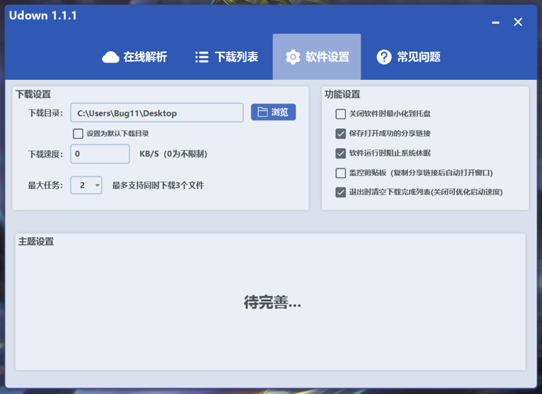 功能设置方面,支持下载速度限制、支持最大任务、支持保持打开成功的分享链接、支持运行时阻止系统休眠、支持监控剪贴板。