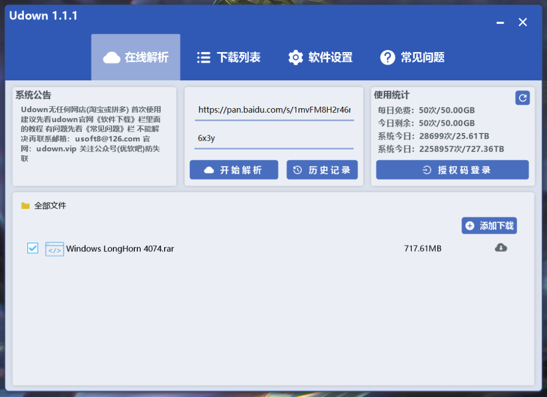 某盘下载限速相信大家都清楚,所以出现了不少第三方不限速下载工具,目前大部分都失效了。今天再给大家分享另外一个神器,根据作者介绍每天有 50GB 的免费流量提供使用,并且无需登录你的账户,只需要输入文件的分享链接和提取码。