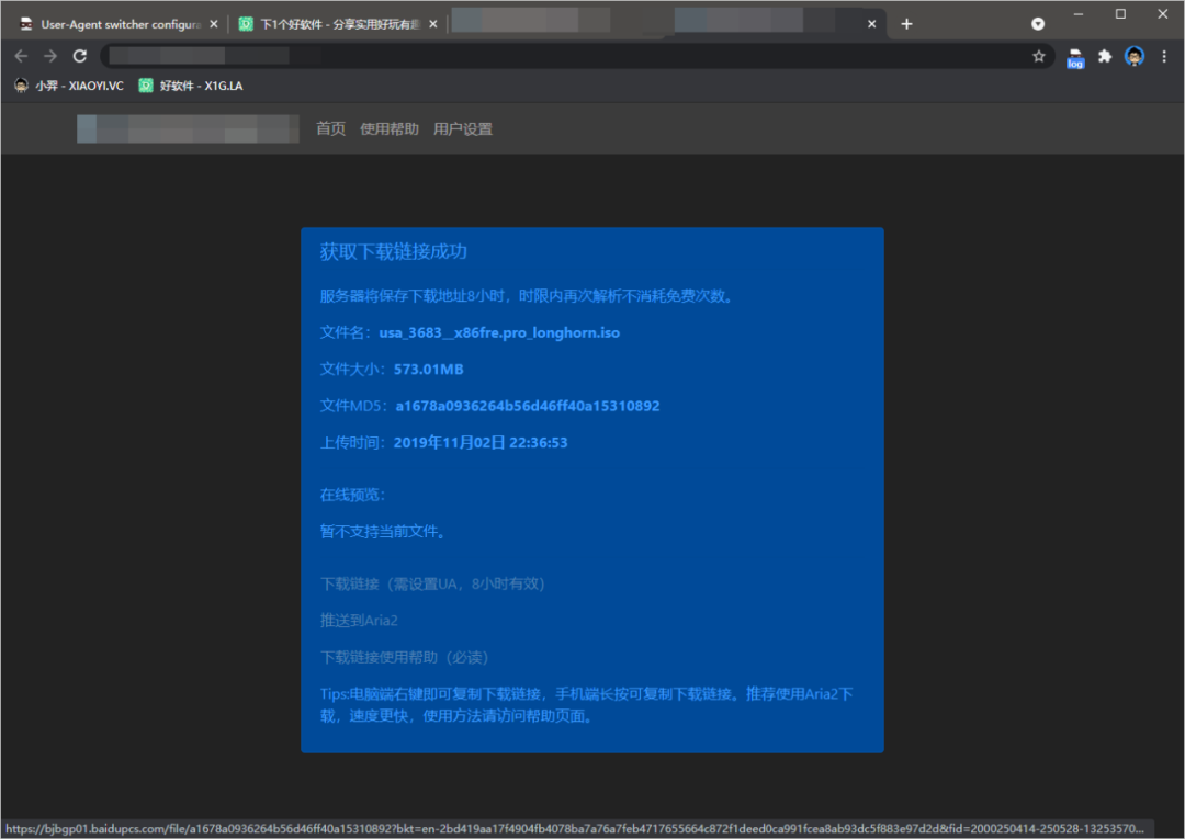 接着打开在线解析网站,输入文件分享的地址,点击获取下载地址。注意,每个 IP 每天只有 20 次的获取。然后点击下载链接,就可以直接下载了。