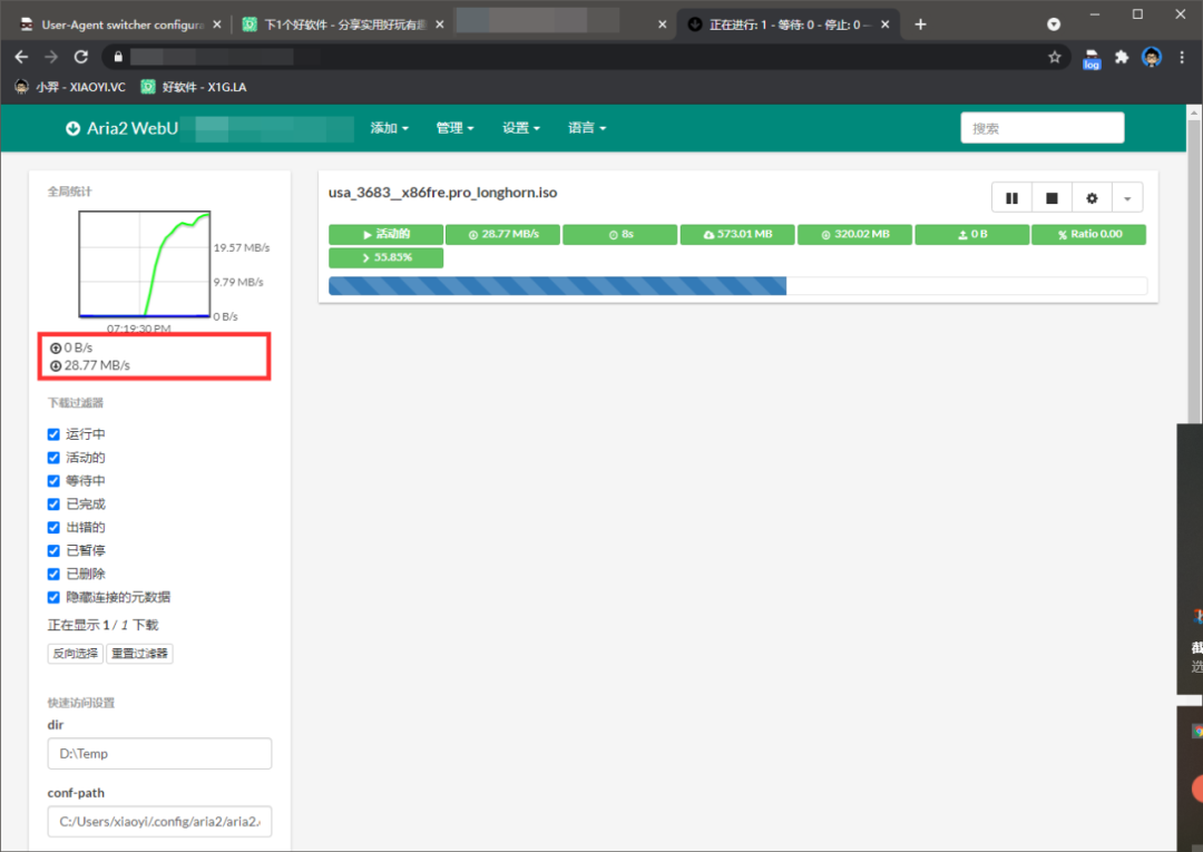 可以看到 Aria2 下载速度比使用 User-Agent 扩展浏览器下载的要快多了,这里锋哥测试,接近达到带宽的极限了,稳定在 28 MB/s 左右。