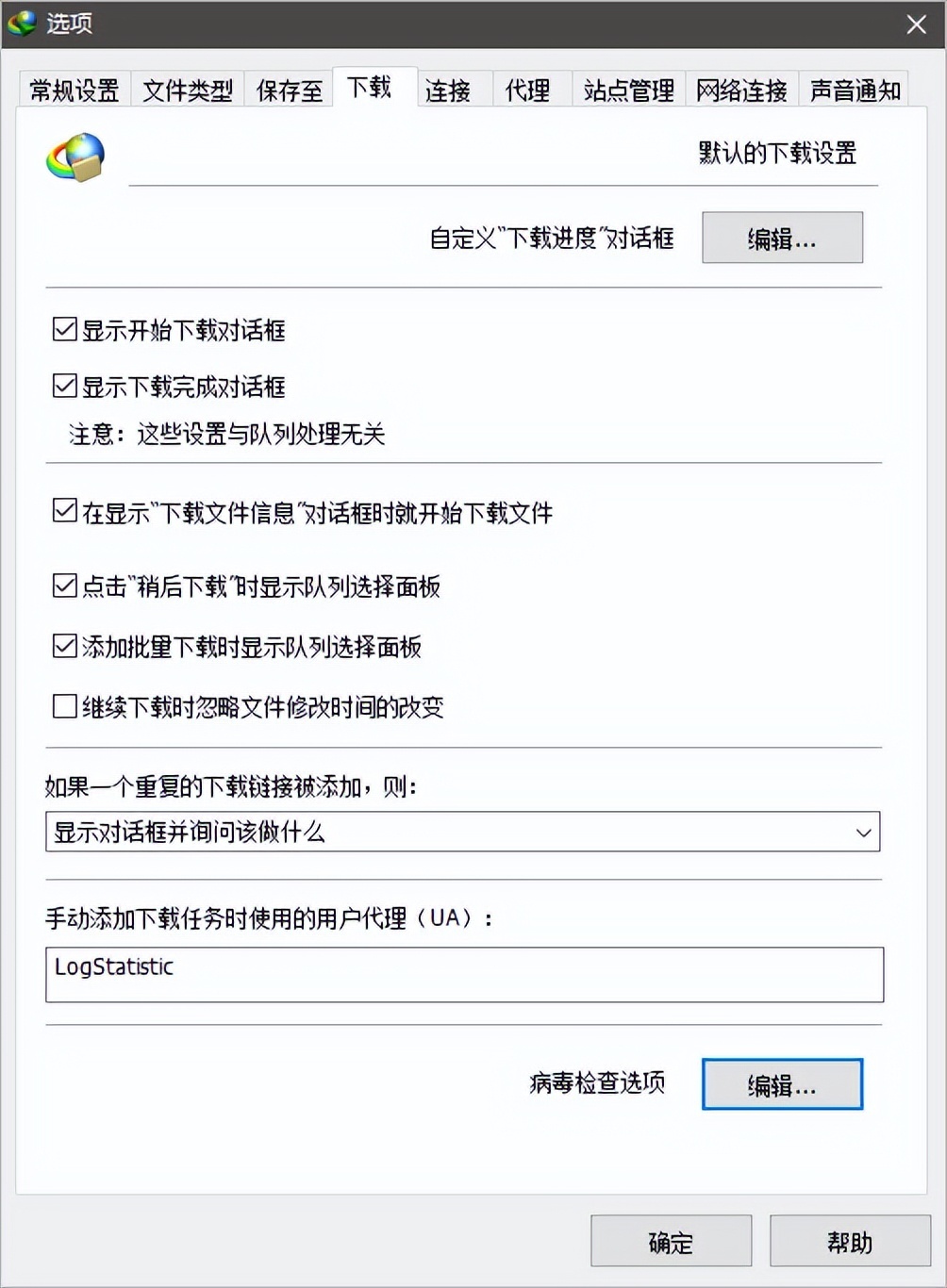 打开 IDM 菜单 → 下载 → 选项,找到下载项目,手动添加任务时使用的用户代理(UA)→ 填入 LogStatistic,然后点确定。如下图。