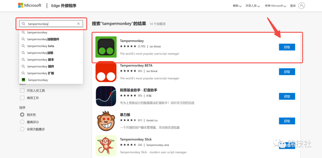 点击浏览器右上角扩展-管理扩展-获取 Microsoft Edge 扩展-在搜索框搜索:Tampermonkey安装即可。(如下图所示)