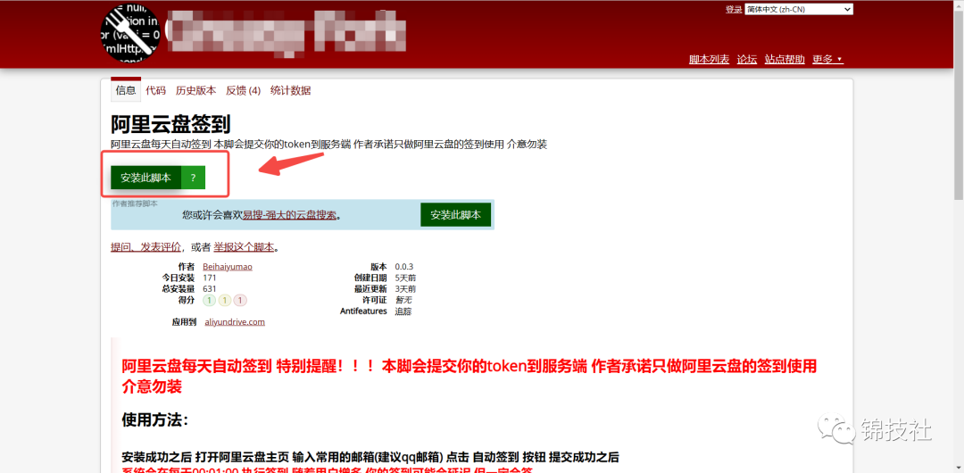 插件安装成功后,直接在浏览器输入需要下载的阿里云盘签到脚本地址(本文文末有获取方式),点击安装此脚本,安装即可。