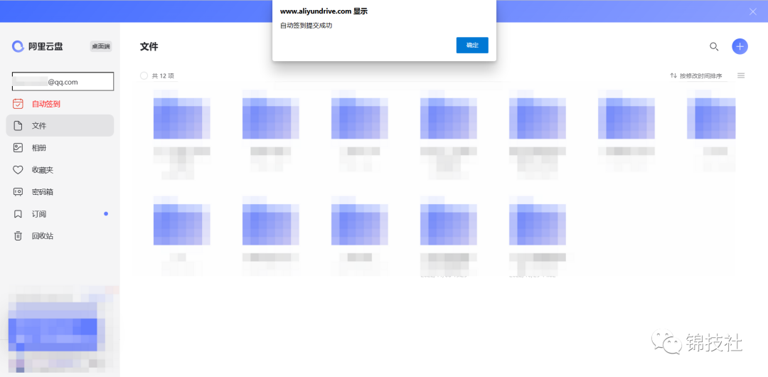 脚本安装成功之后,打开阿里云盘网页端登录,输入常用的邮箱(建议qq邮箱) 点击自动签到按钮提交,出现提交成功按钮即可。