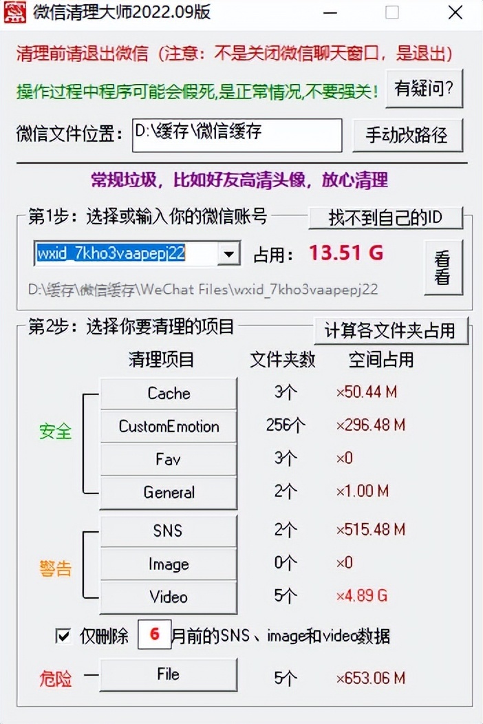 使用的时候,需要退出微信,然后打开软件,手动改路径,找到微信对应的文件位置,最后根据文件占用情况选择性清理。