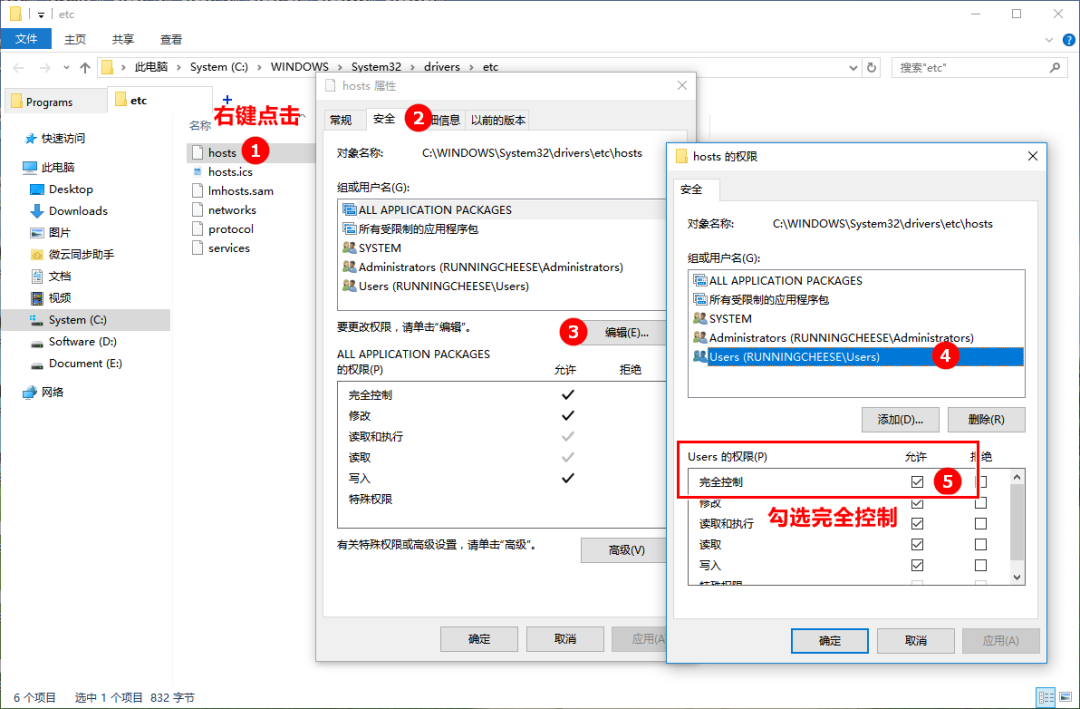如果提示没有修改权限,按下图步骤所示,设置一下权限即可。
