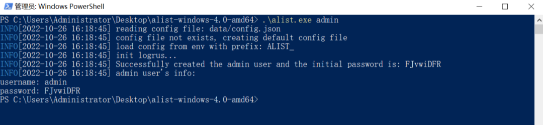 在命令行模式下输入 .\alist.exe admin 先查看管理AList后台的账号和密码。