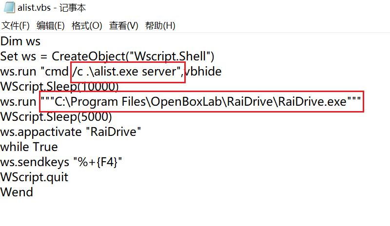 这个脚本是网上找来的,但是由于在现在的版本里面需要 server 启动命令,如果你直接下载下来会发现是不能用的,所以要先加上,另外将脚本里面的RaiDrive路径,替换成你的安装路径。