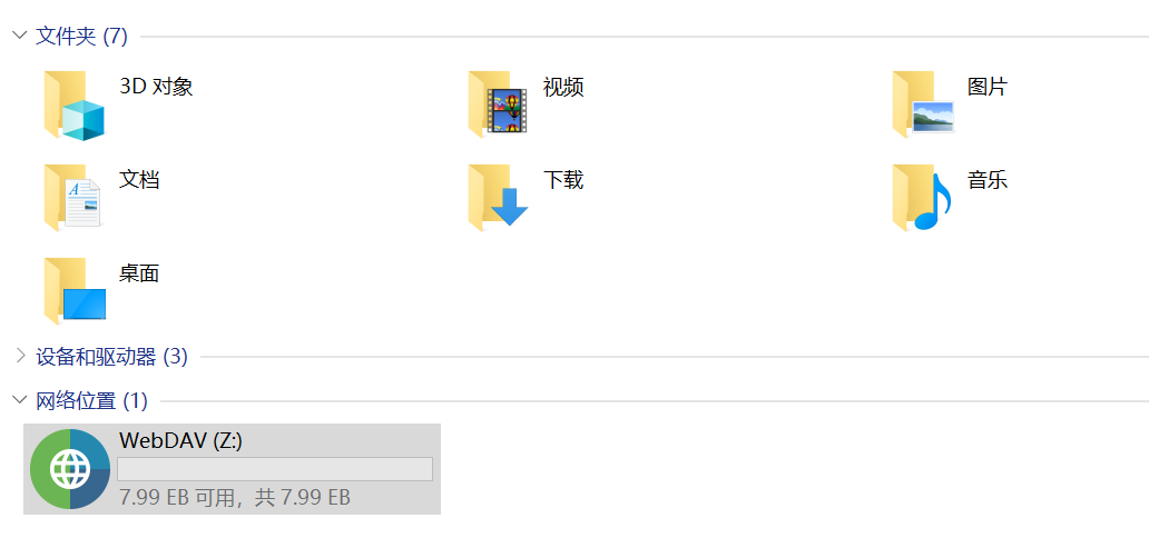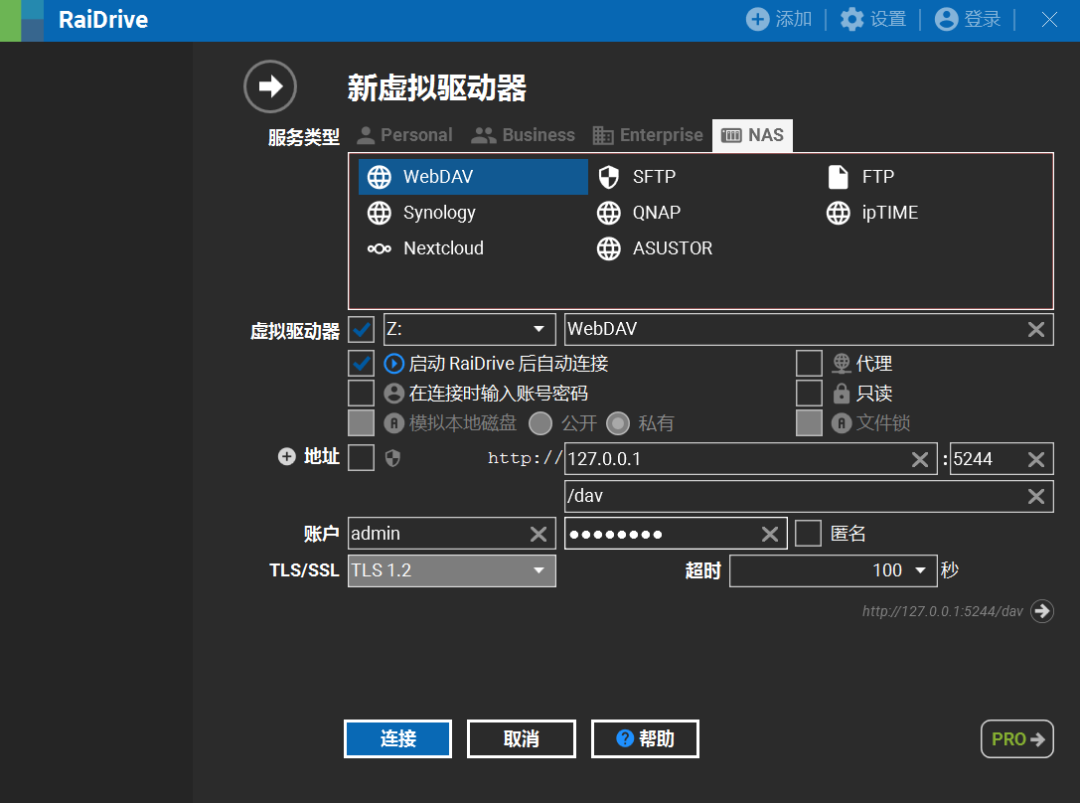 然后就能用第三方软件RaiDrive挂载到本地了。使用RaiDrive填写好下面的地址,就能看到多出来的盘。