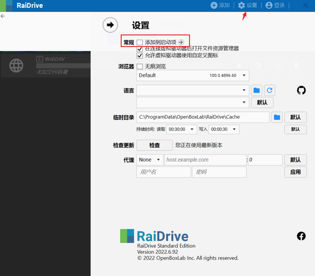 首先需要将RaiDrive的开机自动启动关闭,因为在它启动之前,需要先将AList启动才能连通,所以我们直接用脚本启动两个软件,不需要它自己动。
