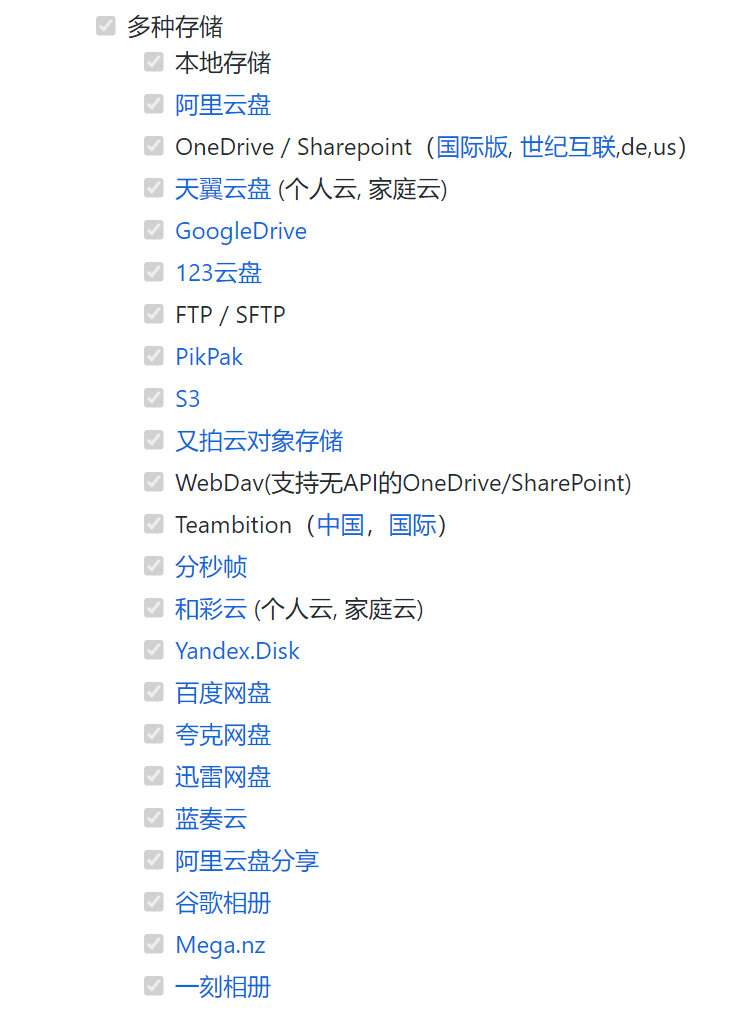 具体支持的储存有下面这些类型,基本上常用的主流网盘都在这,其中像是免费的123网盘、蓝奏云盘、以及老司机比较喜欢的PikPak都支持,除了网盘,谷歌相册和一刻相册也支持,还有对大家来说比较小众的视频创作协助平台-分秒帧也在支持列表里面。