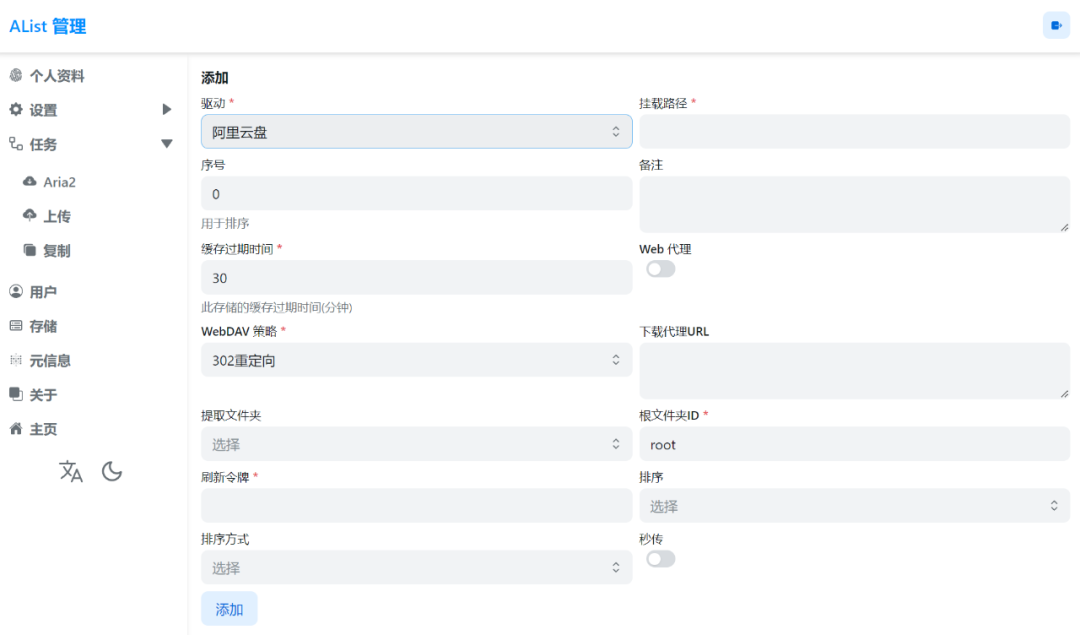 添加一个阿里网盘试试,需要填写一些参数,每个网盘添加的方式都有一点区别。