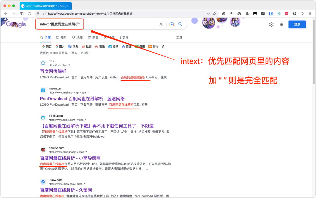 intext 命令会优先匹配网页里的内容,而不是标题,双引号 “”,则会完整匹配搜索内容。