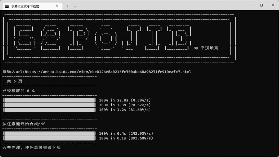 这是第二次使用,输入文档地址后,无需扫码登录,回车后自动下载,再次回车自动合成pdf。