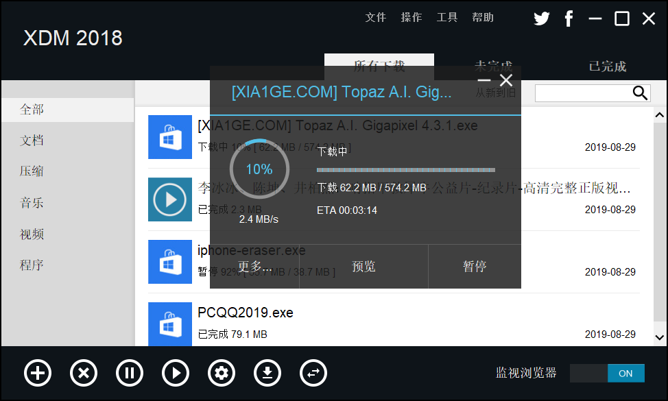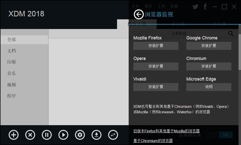 「XDM 2018」可以支持各大主流浏览器,如:谷歌浏览器,火狐浏览器,Opera,Edge,需要在浏览器监视里面安装扩展支持,这样就可以嗅探网页里的下载地址了。
