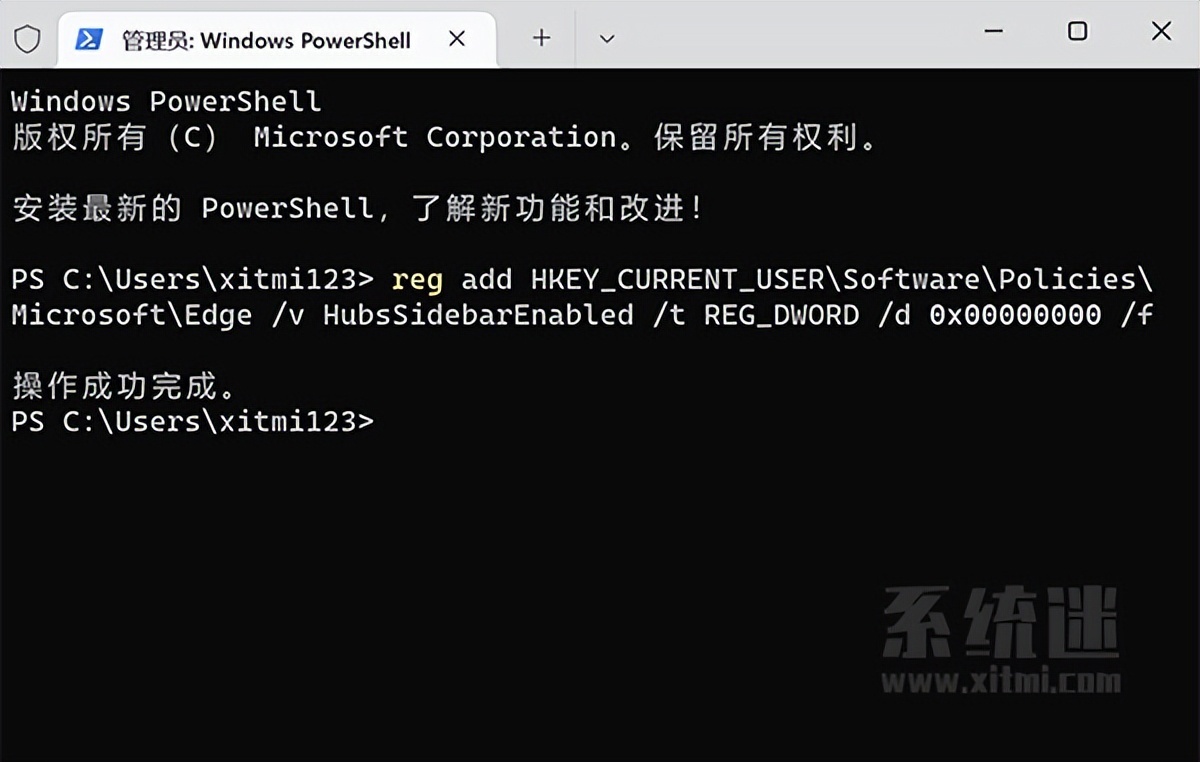 reg add HKEY_CURRENT_USER\Software\Policies\Microsoft\Edge /v HubsSidebarEnabled /t REG_DWORD /d 0x00000000 /f