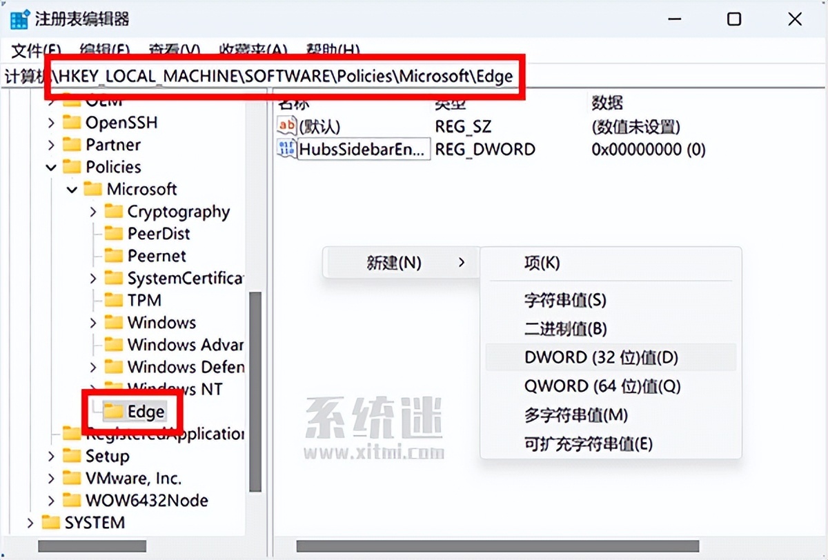 4、在Edge文件夹左侧界面空白处,右键选择“新建-DWORD(32 位)值”