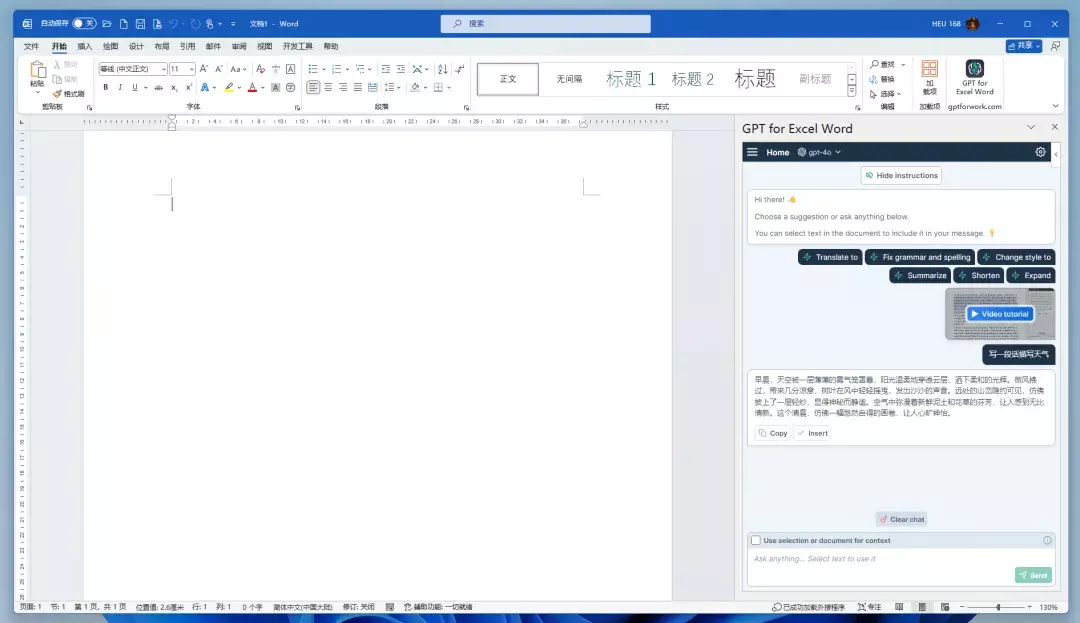 在Word中,测试了一下AI模块的效果,不用科学上网即可使用,效果还可以。