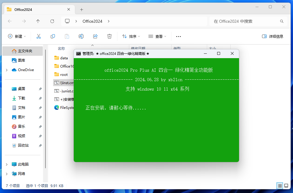 Office 2024仅支持Win10/11系统,将压缩包下载下来后解压,然后以管理员身份运行“!)inst.cmd”,稍等片刻,Office 2024就成功安装了。需要注意的是:安装精简版之前,务必将系统中已有的Office全部卸载干净,否则容易出现异常。