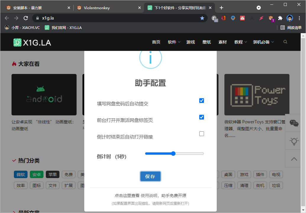 功能设置上支持自动填写提取码并提交,支持网盘链接浏览器前台标签页打开、倒计时结束自动打开链接。