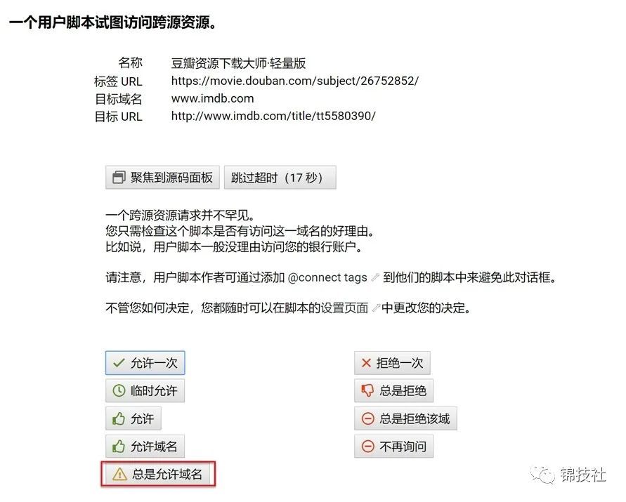 推荐用暴力猴食用,如果一定要用Tampermonkey食用,请务必确保在安装完豆瓣资源下载大师后,第一次访问豆瓣页面时在弹出窗口点击总是允许域名,然后再刷新一遍页面:
